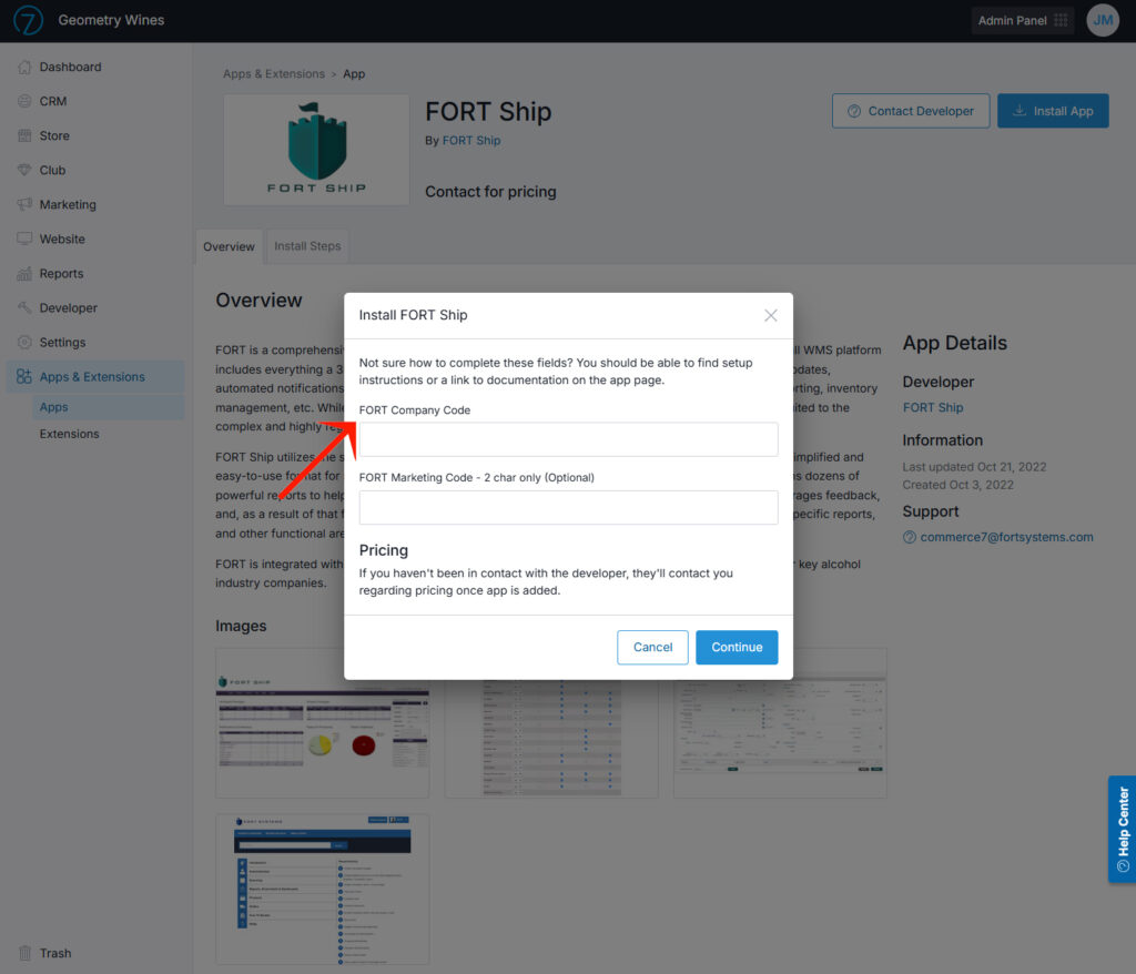 Go to the Apps & Extensions area in Commerce7, and scroll down to the FORT apps. Whether you are installing FORT WMS or FORT Ship, the install process is the same: